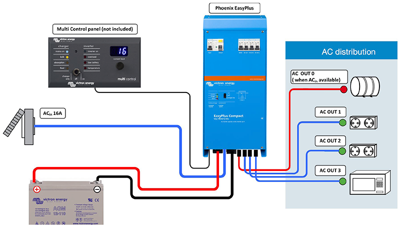 The DC output of the SmartSolar 250/100 MPPT is parallel wired with the DC connection of the MultiPlus-II inverter/charger.